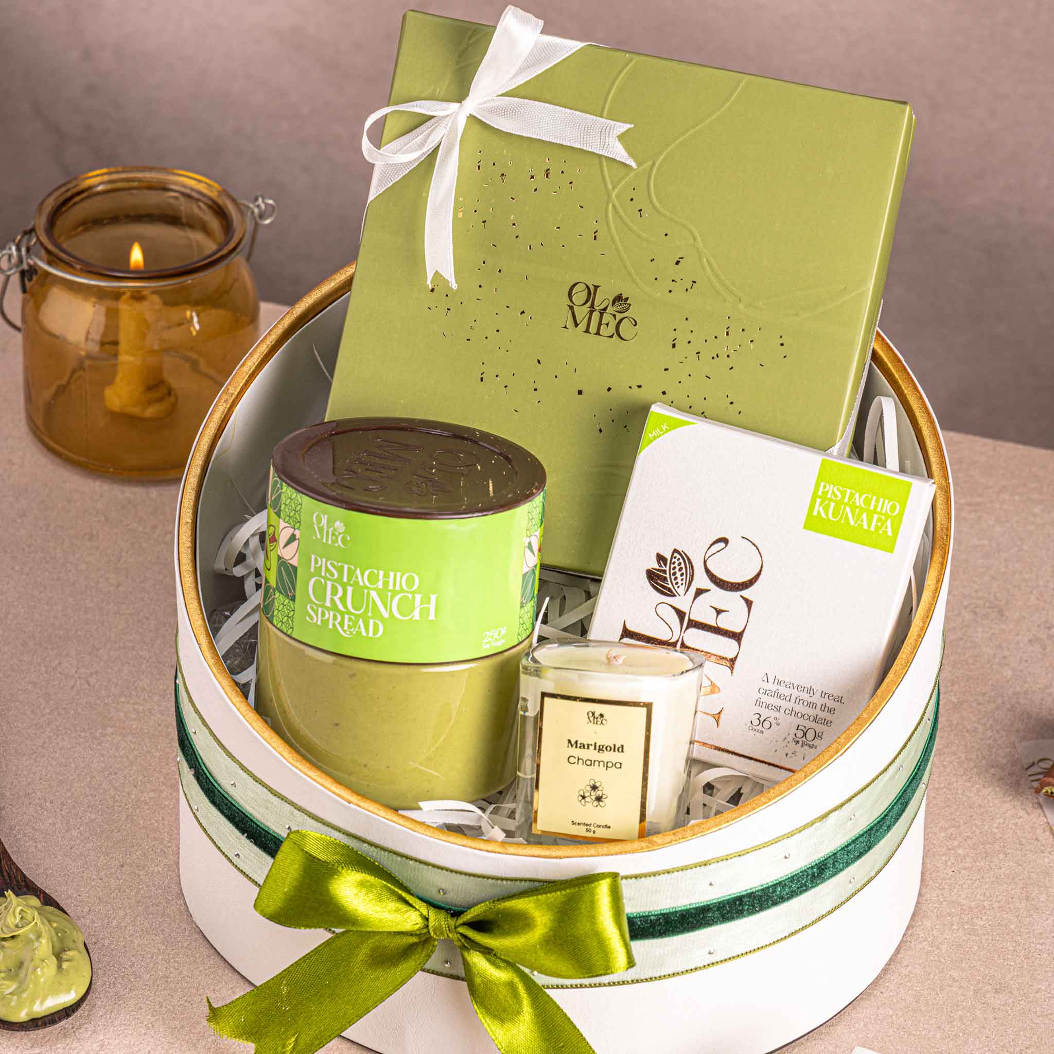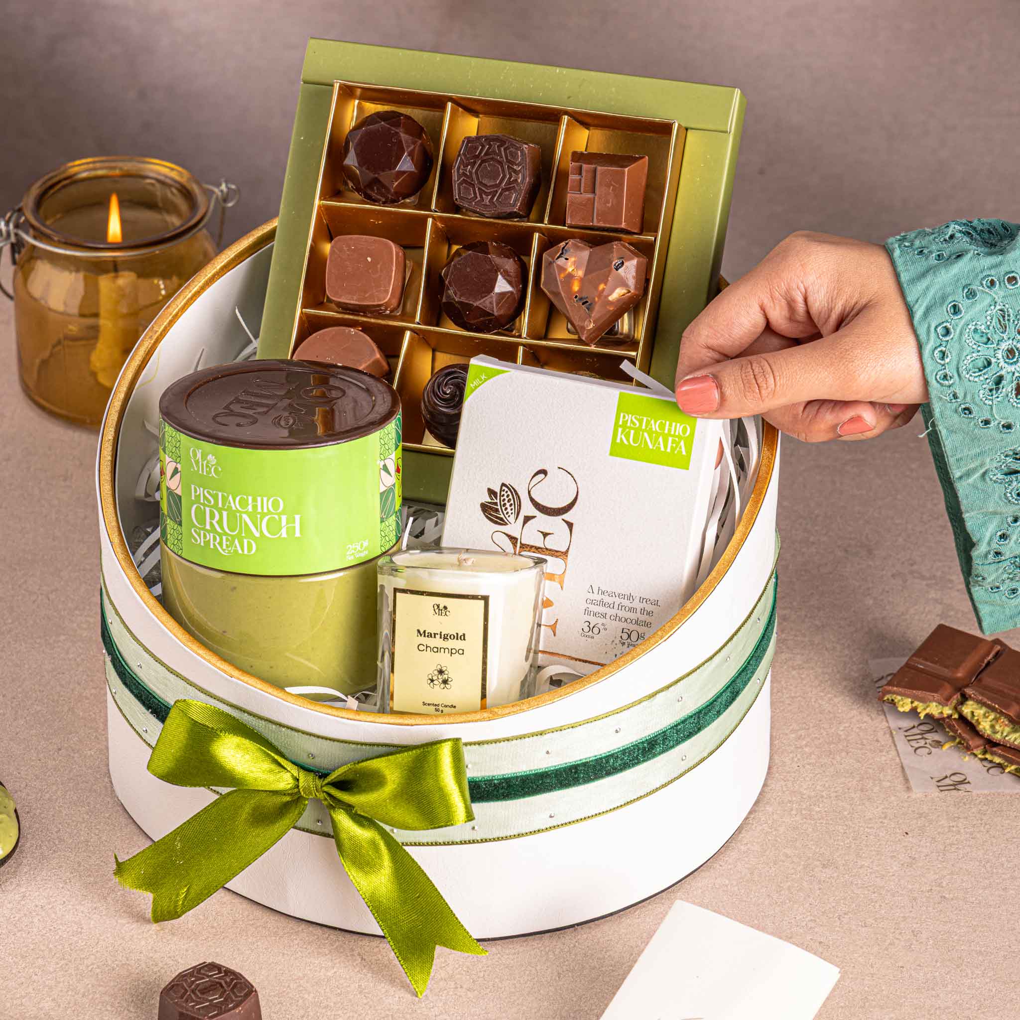 Blessed brings together an Olive Box of 9 bon bons, pistachio crunch spread, and our signature pistachio kunafa chocolate bar, beautifully arranged in a keepsake hamper made for meaningful gifting.