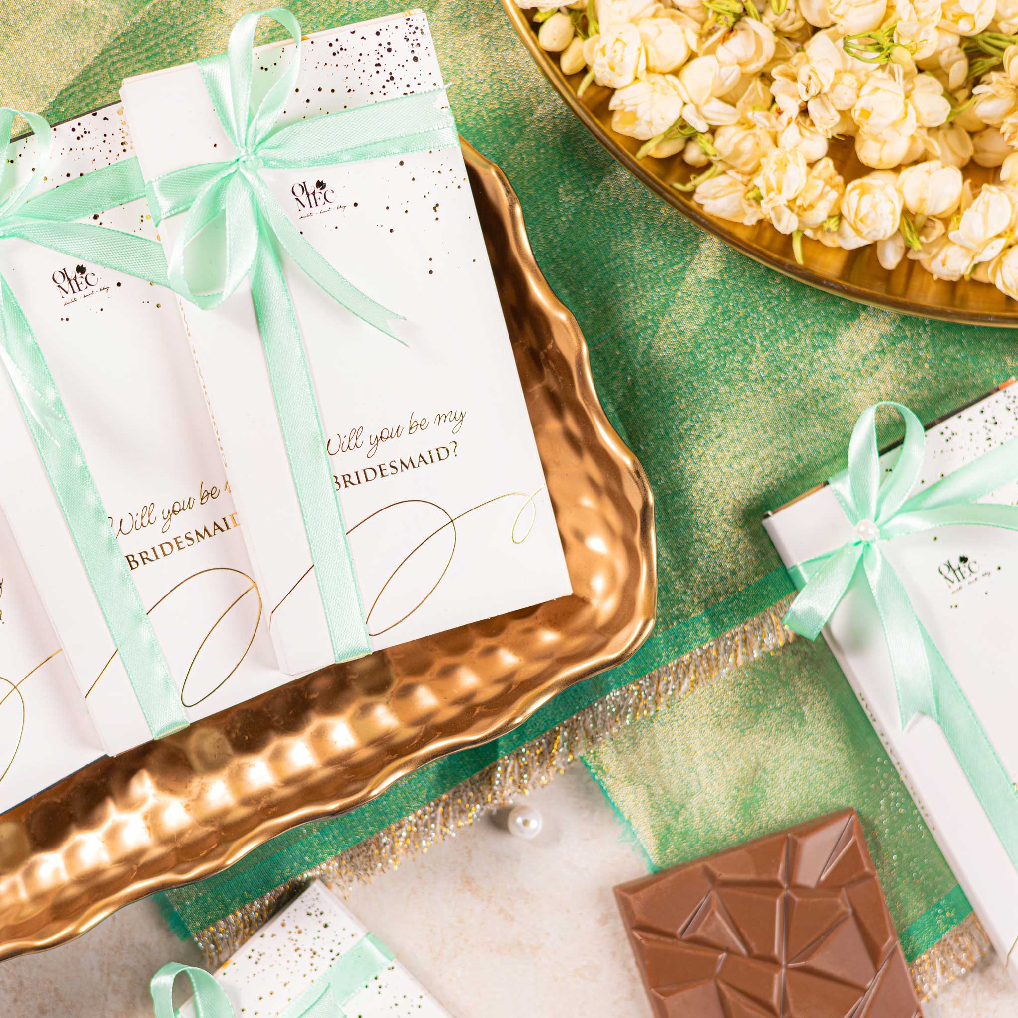 Say “Will you be my bridesmaid?” with beautifully wrapped Olmec chocolate bar, elegantly finished with a ribbon of your choice to match your theme