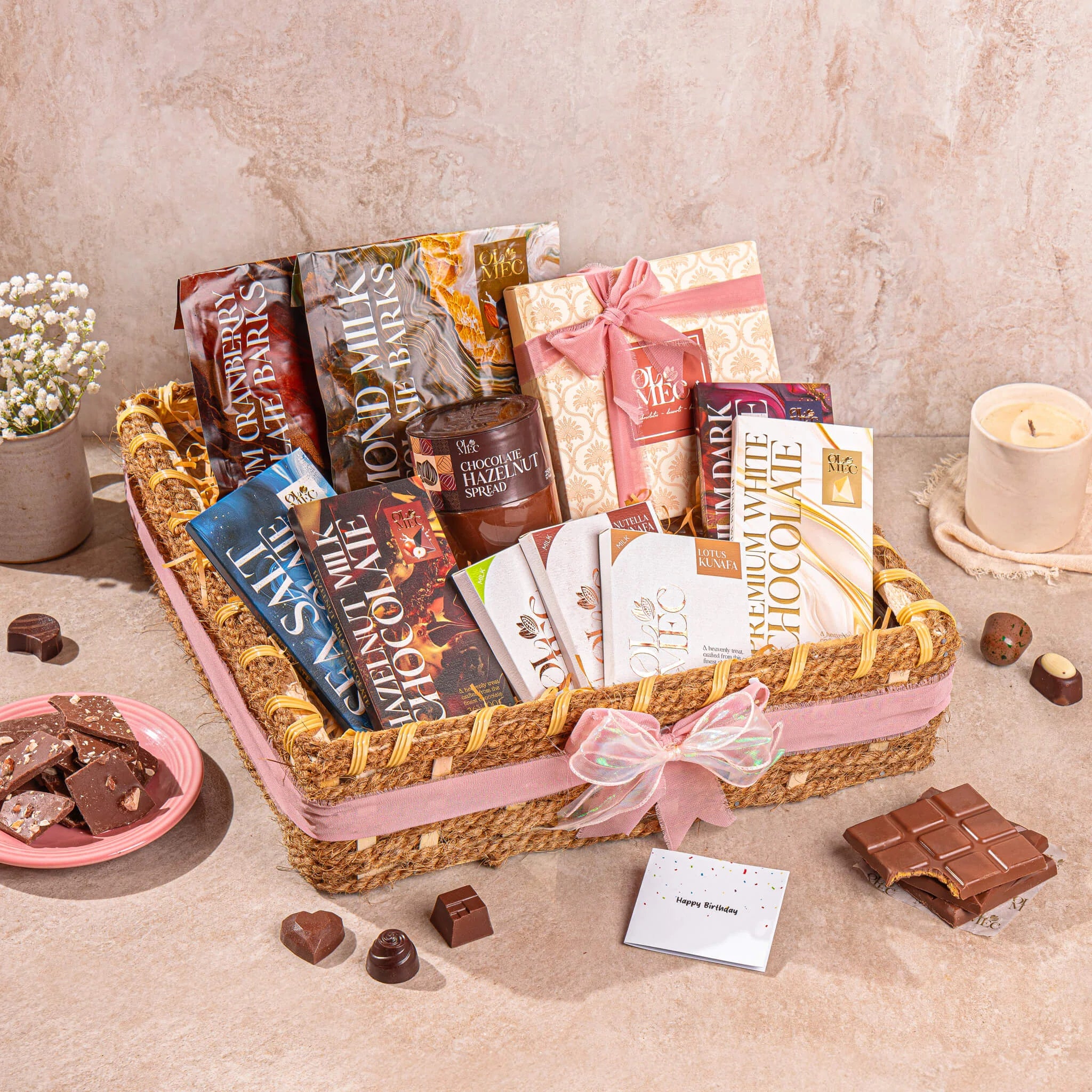 A loaded coconut basket with bon bons, Kunafa Bars, barks, and hazelnut spread — the perfect mix for every chocolate craving.