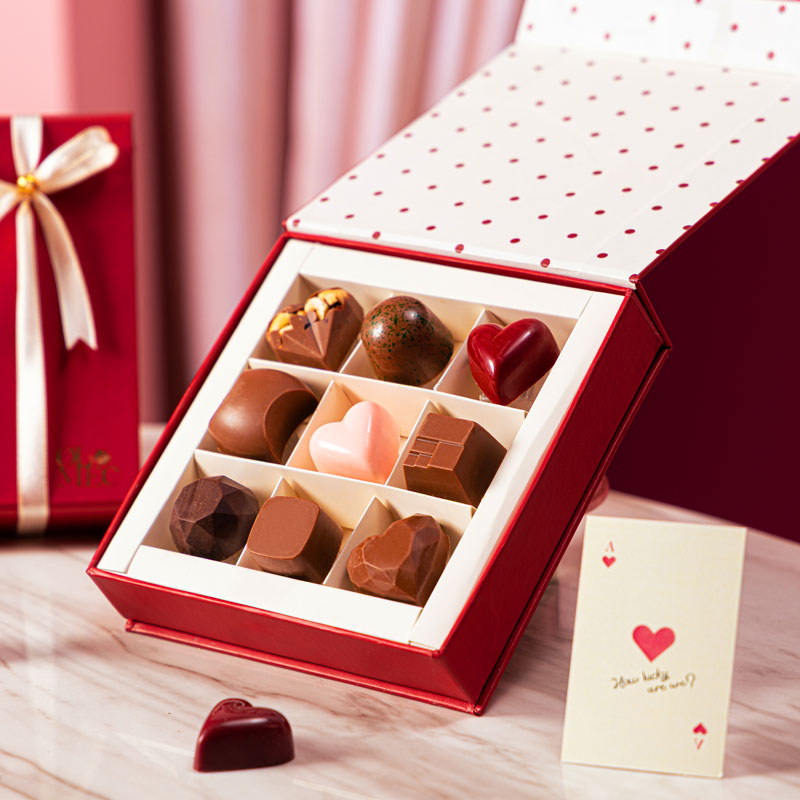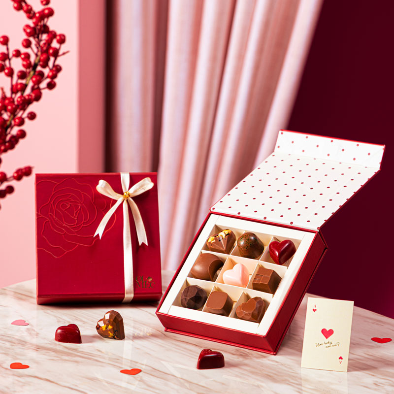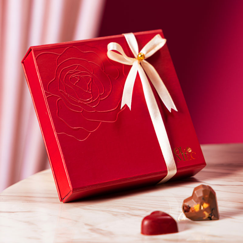 A love letter, but make it chocolate Nine dreamy bon bons inside a deep red, rose-embossed box—classic, romantic, and forever gift-worthy.