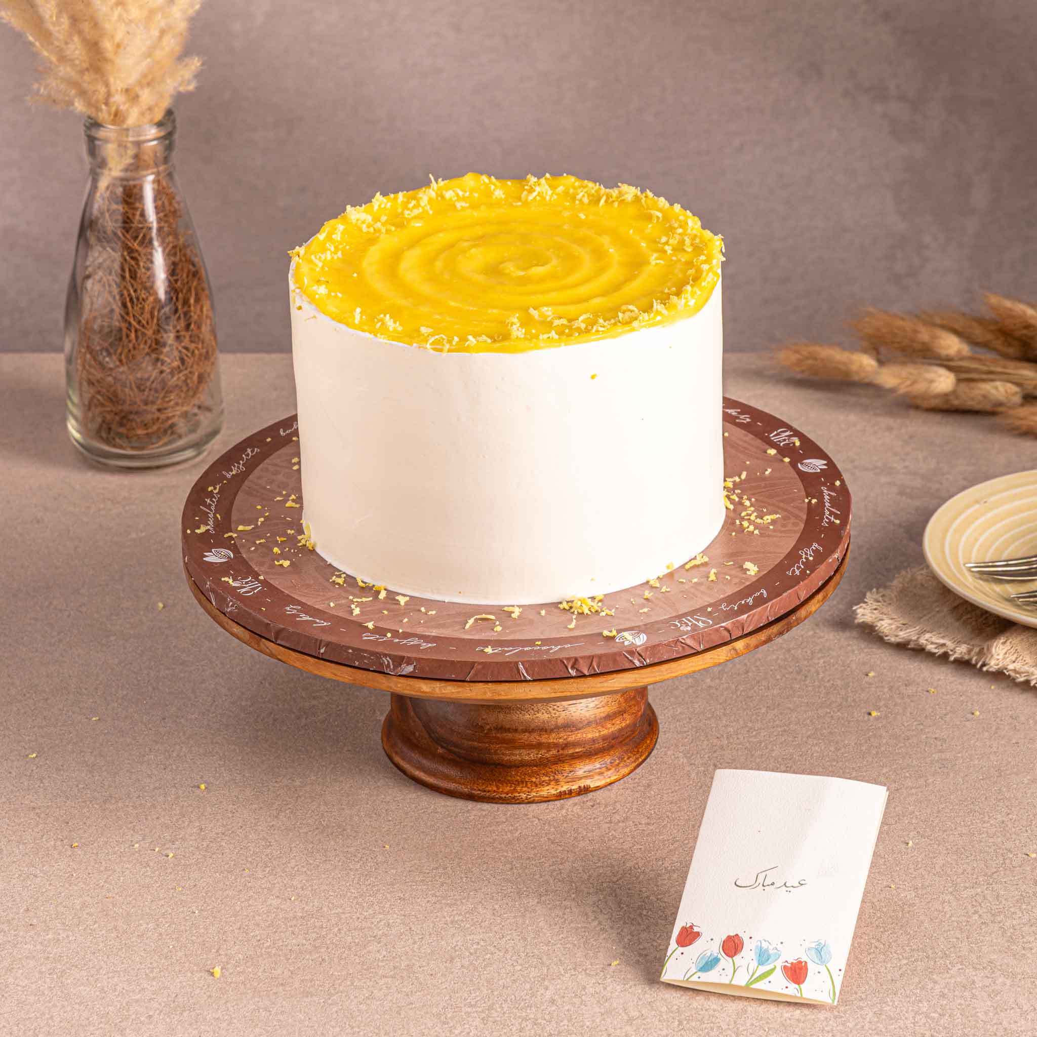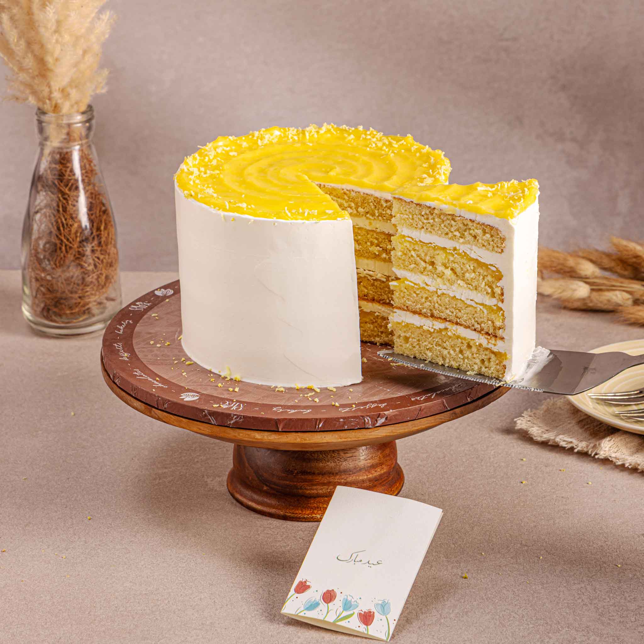 Light vanilla sponge layered with smooth lemon cream and topped with a vibrant lemon glaze for a fresh, citrusy finish.
