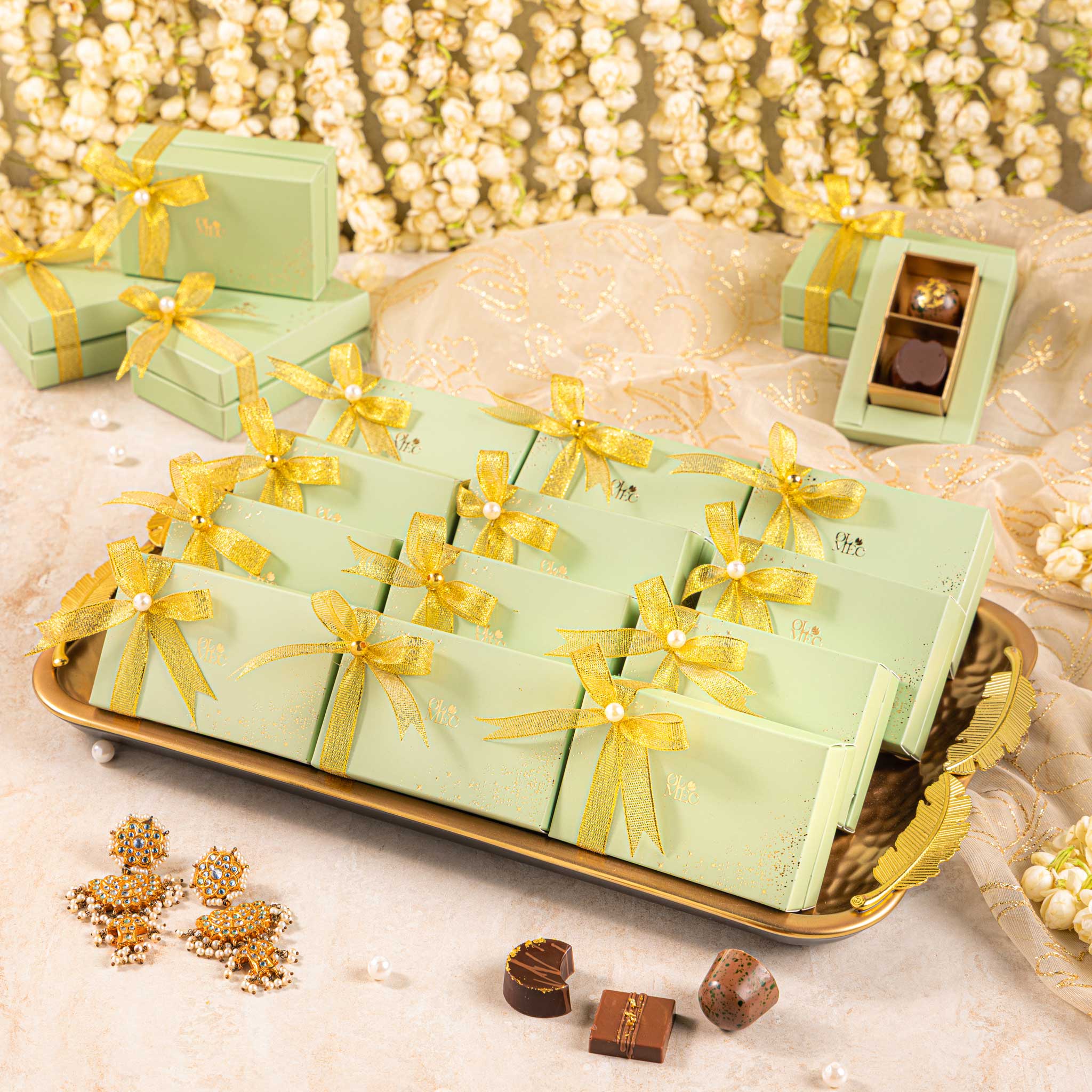 A beautiful mint green favor box tied with gold ribbon & filled with Olmec bon bons – perfect for wedding gifting.