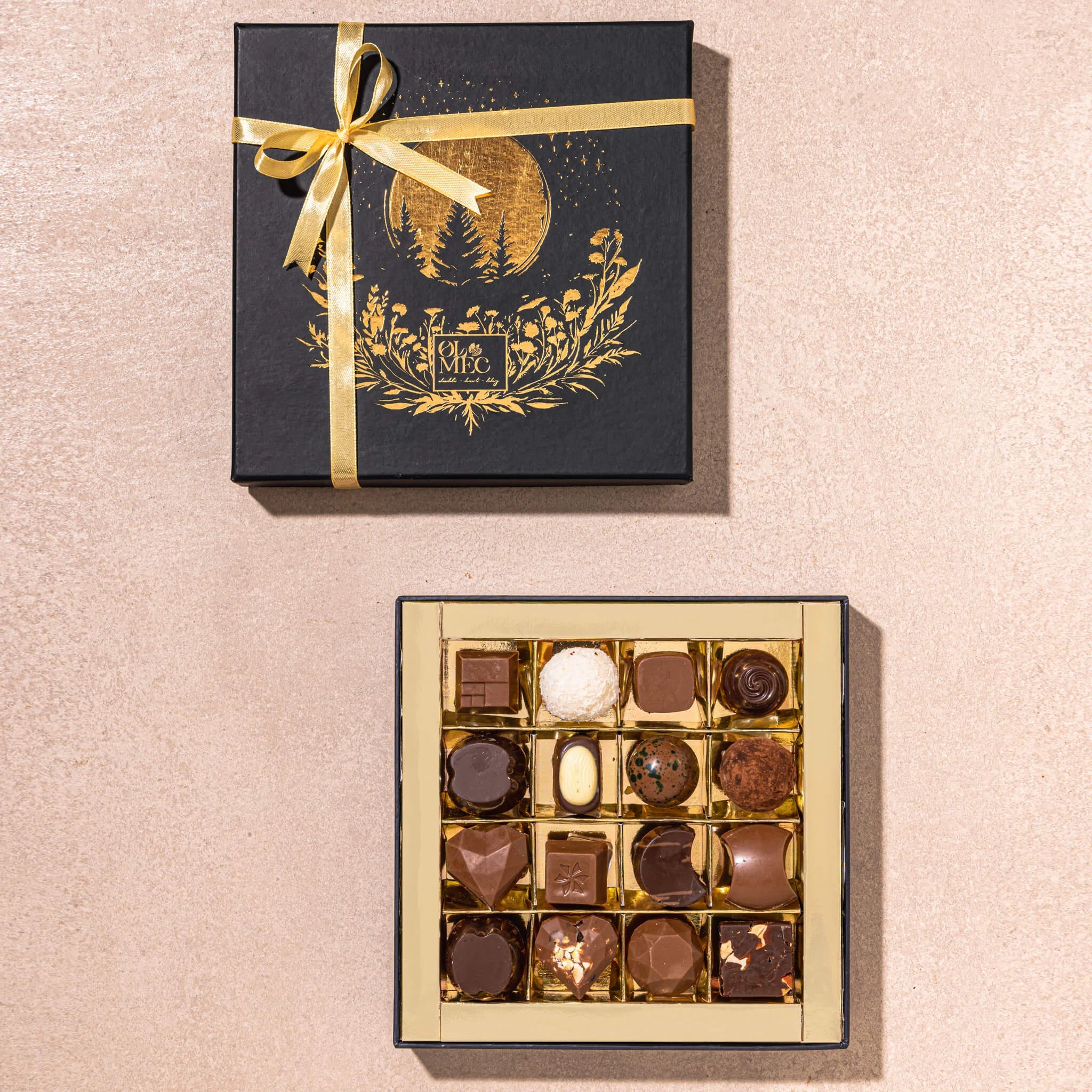 A celestial-inspired box of 16 artisanal bon bons, wrapped in deep midnight tones and gold detailing — elegant, indulgent, and perfect for making celebrations feel timeless.