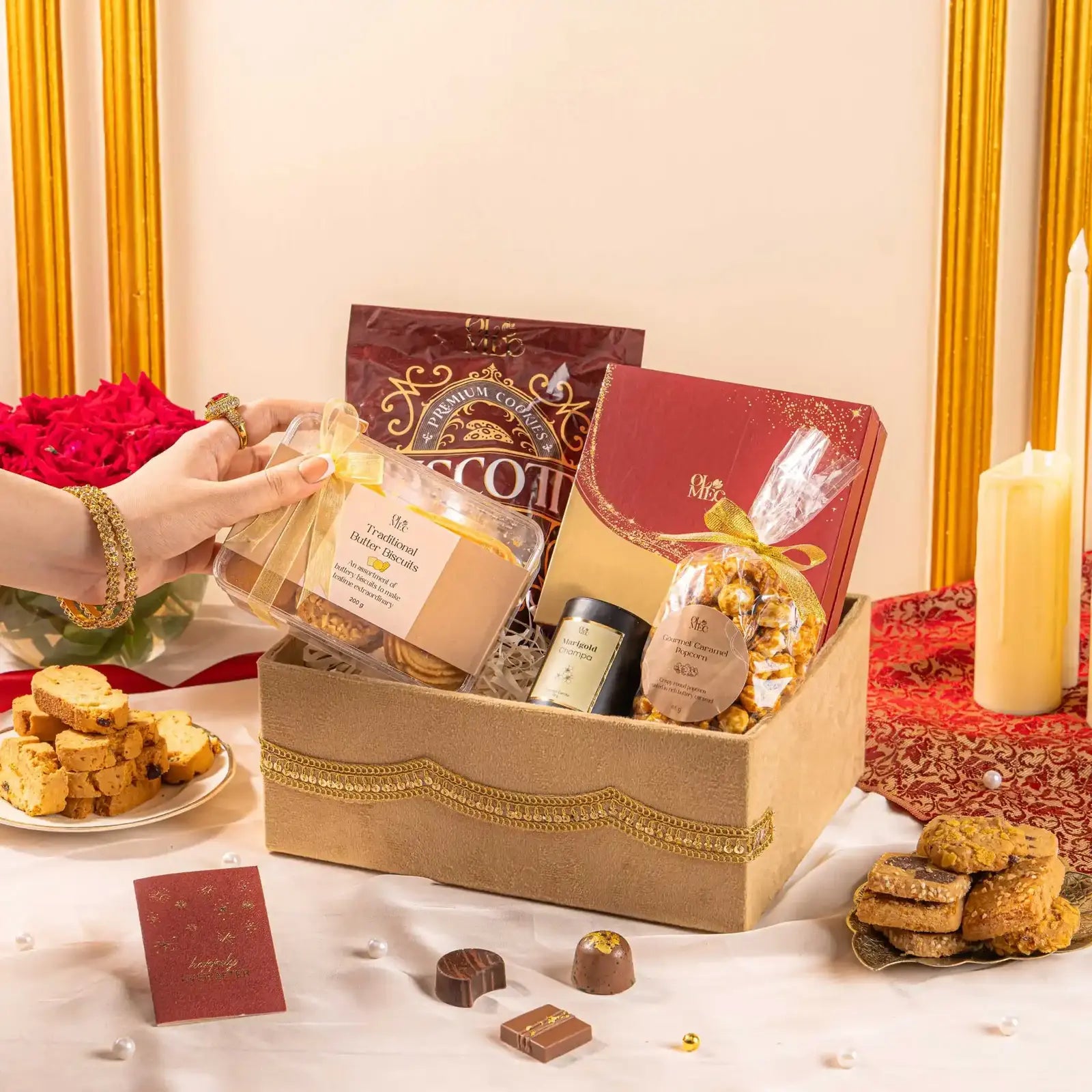 A romantic keepsake hamper with bon bons, gourmet popcorn, and a candle — designed to sweeten your nikkah moments
