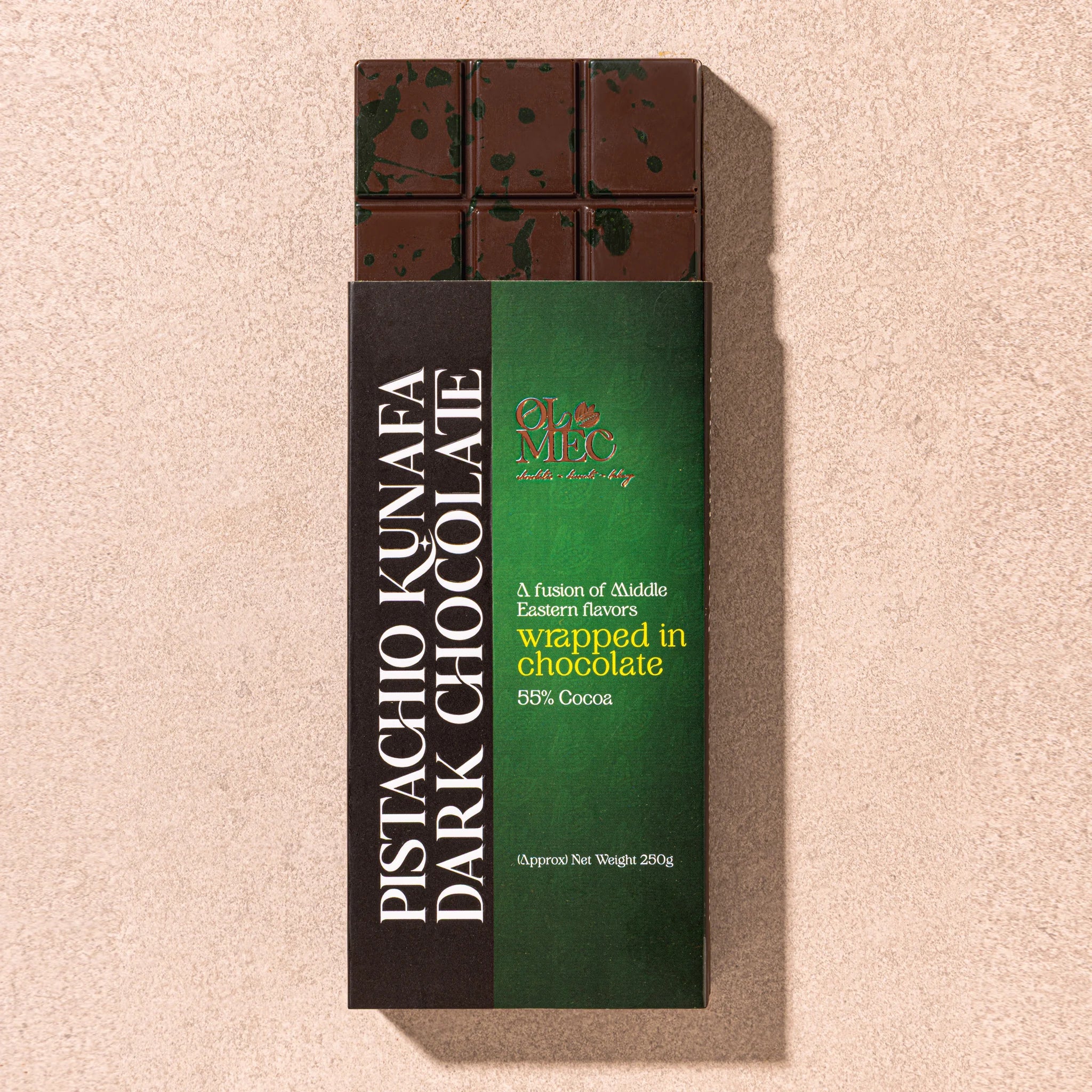 Made with 55% Cocoa, roasted pistachios, and crisp kunafa strands, this bold creation is inspired by the iconic Dubai chocolate kunafa — rich, crunchy, and layered with Middle Eastern flair for a next-level indulgence.