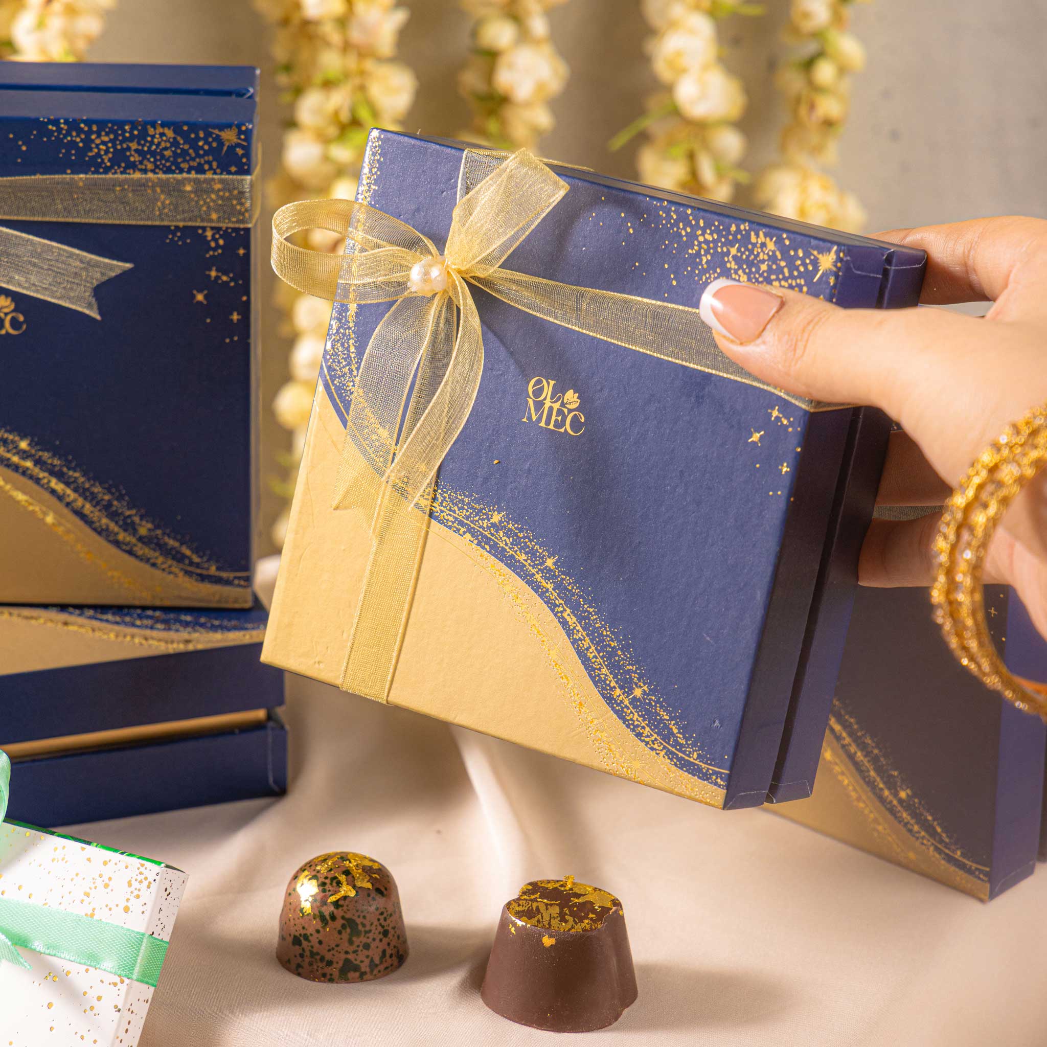 A stunning sapphire favor box adorned with gold accents & filled with Olmec bon bons – made for your wedding celebrations.